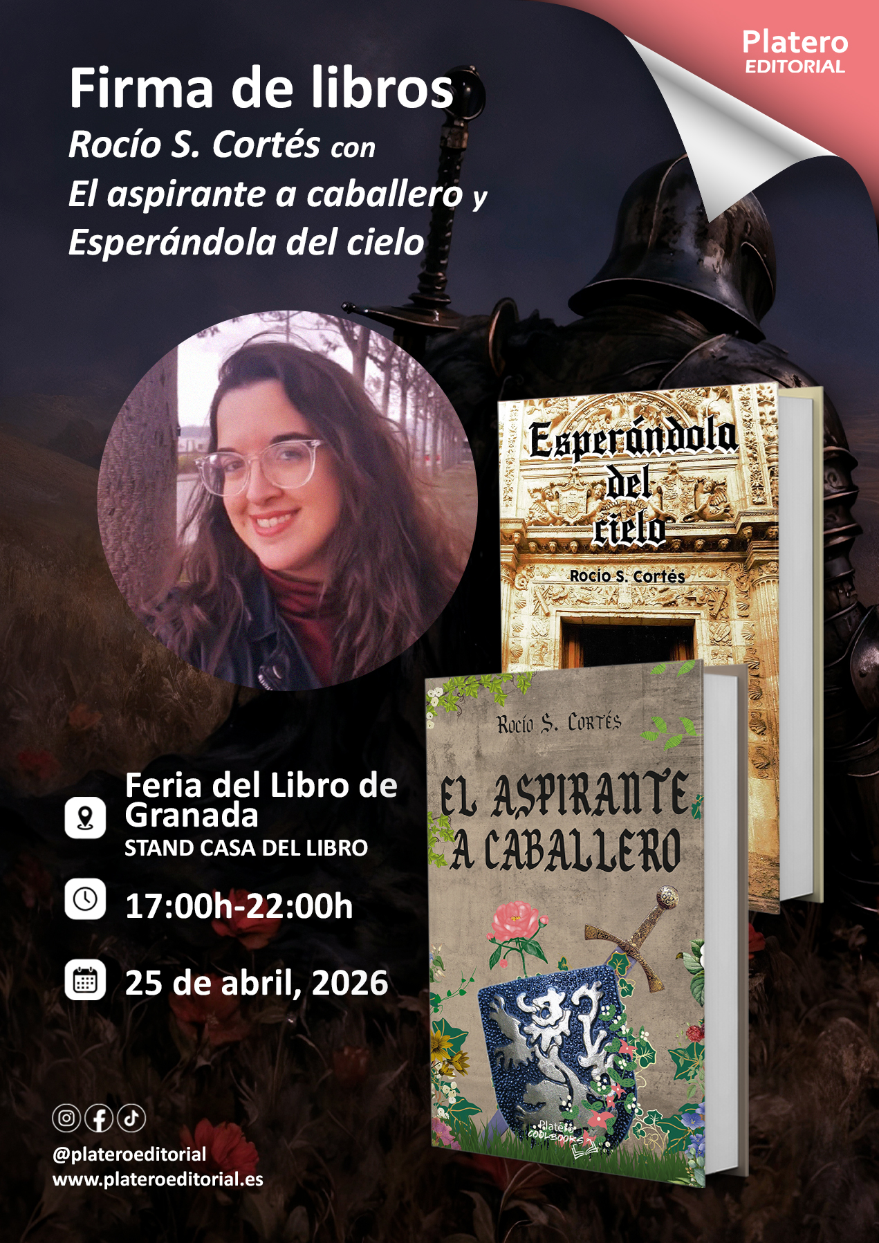 El próximo 25 de abril de 2026 nuestra autoraRocío S. Cortés estará en la Feria del libro de Granada (Stand Casa del Libro) de 17h a 22h con sus obras: Aspirante a caballero y Esperándola del cielo.