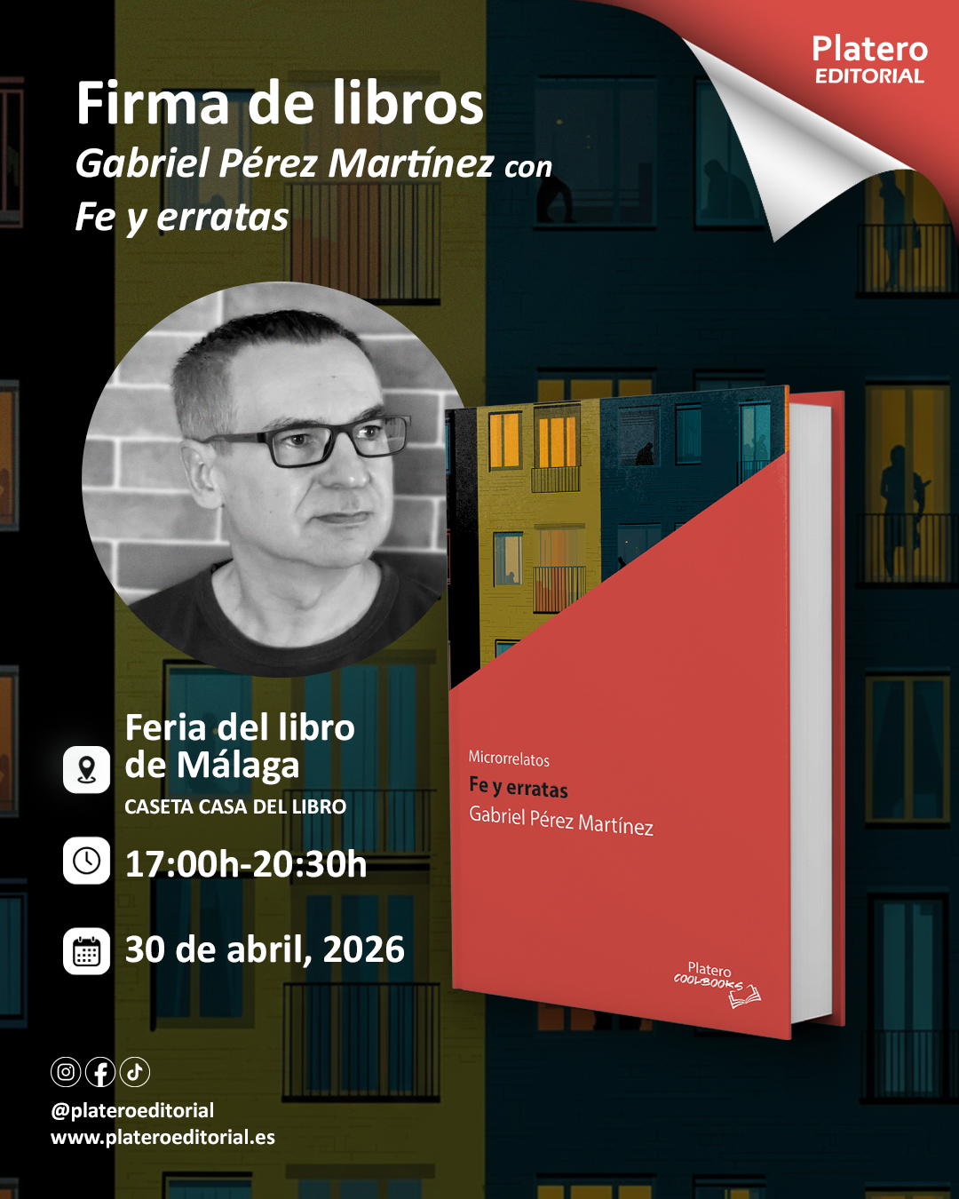 Nueva firma de Gabriel Pérez Martínez con su libroFe y erratas, en la Feria del Libro de Málaga de 17:00h-20:30h el 30 de abril de 2026.