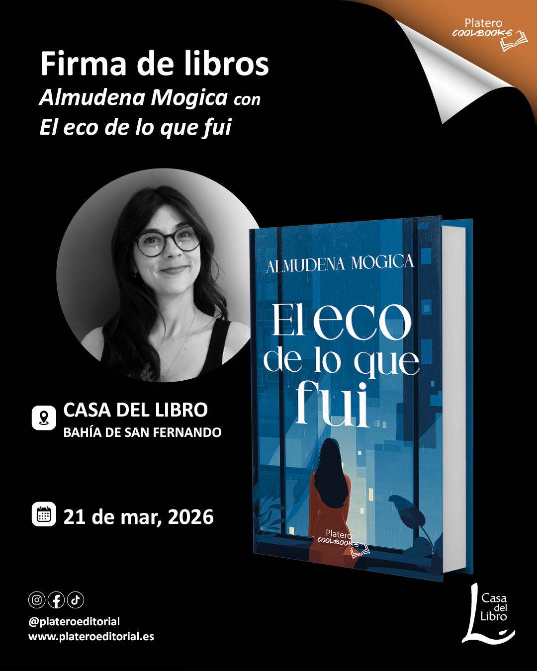 Nuestra autora Almudena Mogica presenta su nuevo libro"El eco de lo que fui"en la Casa del Libro de la Bahía de San Fernando el día 21 de marzo de 2026.