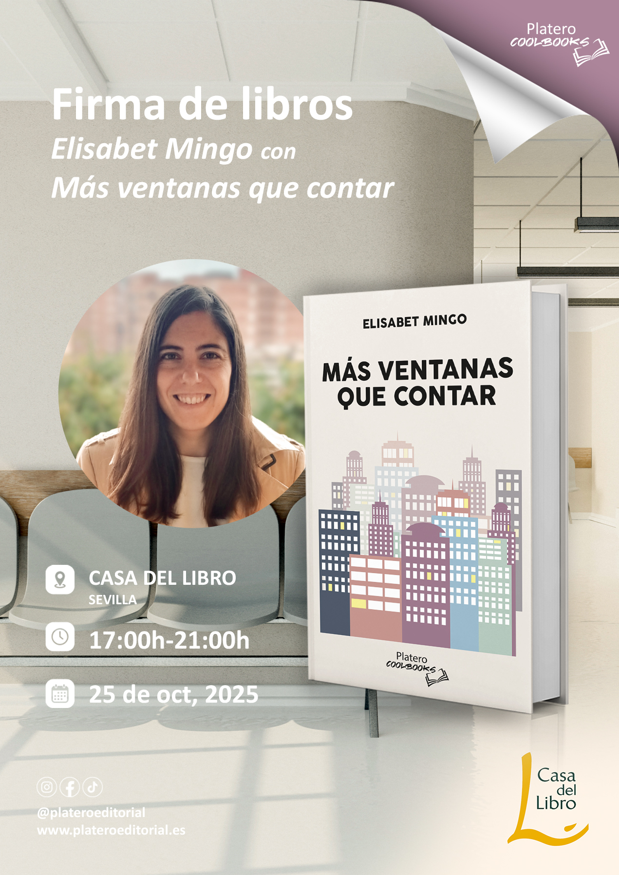 El próximo 25 de octubre de 17-21 horas en Casa del Libro de Sevilla, nuestra autora Elisabet Mingo firmará ejemplares de su nueva obra Más ventanas que contar.