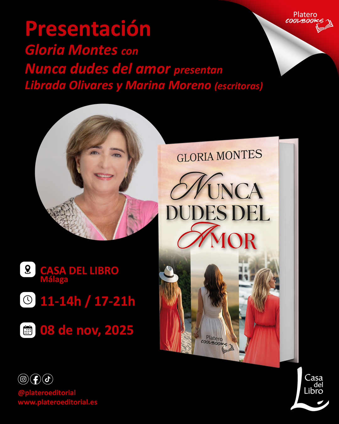 Nuestra autora Gloria Montes presentará y firmará ejemplares de su nueva obra Nunca dudes del amor tras Nunca renuncies al amor la segunda parte de la bilogía Amor y amistad. El próximo 08 de noviembre a las 11h-14h y 17h-21h en Casa del Libro de Málaga.