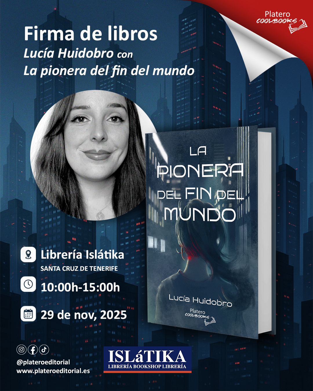 El próximo 29 de noviembre a las 10:00-15:00h a cierre en la Librería Islátika Santa Cruz de Tenerife nuestra autora Lucía Huidobro firmará ejemplares de su novelaLa pionera del fin del mundo.