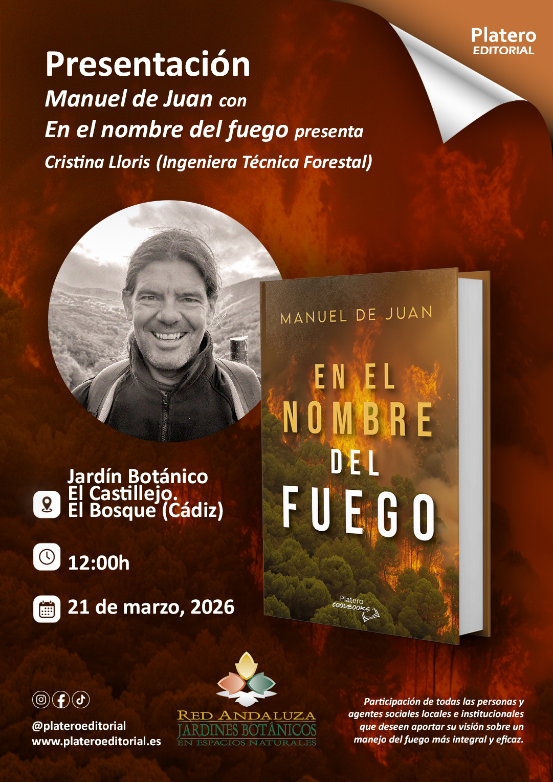 Nuestro autor Manuel de Juanpresentará y firmará su nuevo libro "En el nombre del fuego" en el Jardín Botánico El Castillejo en El Bosque (Cádiz). El evento estará presentado por Cristina Lloris, ingeniera técnica forestal.