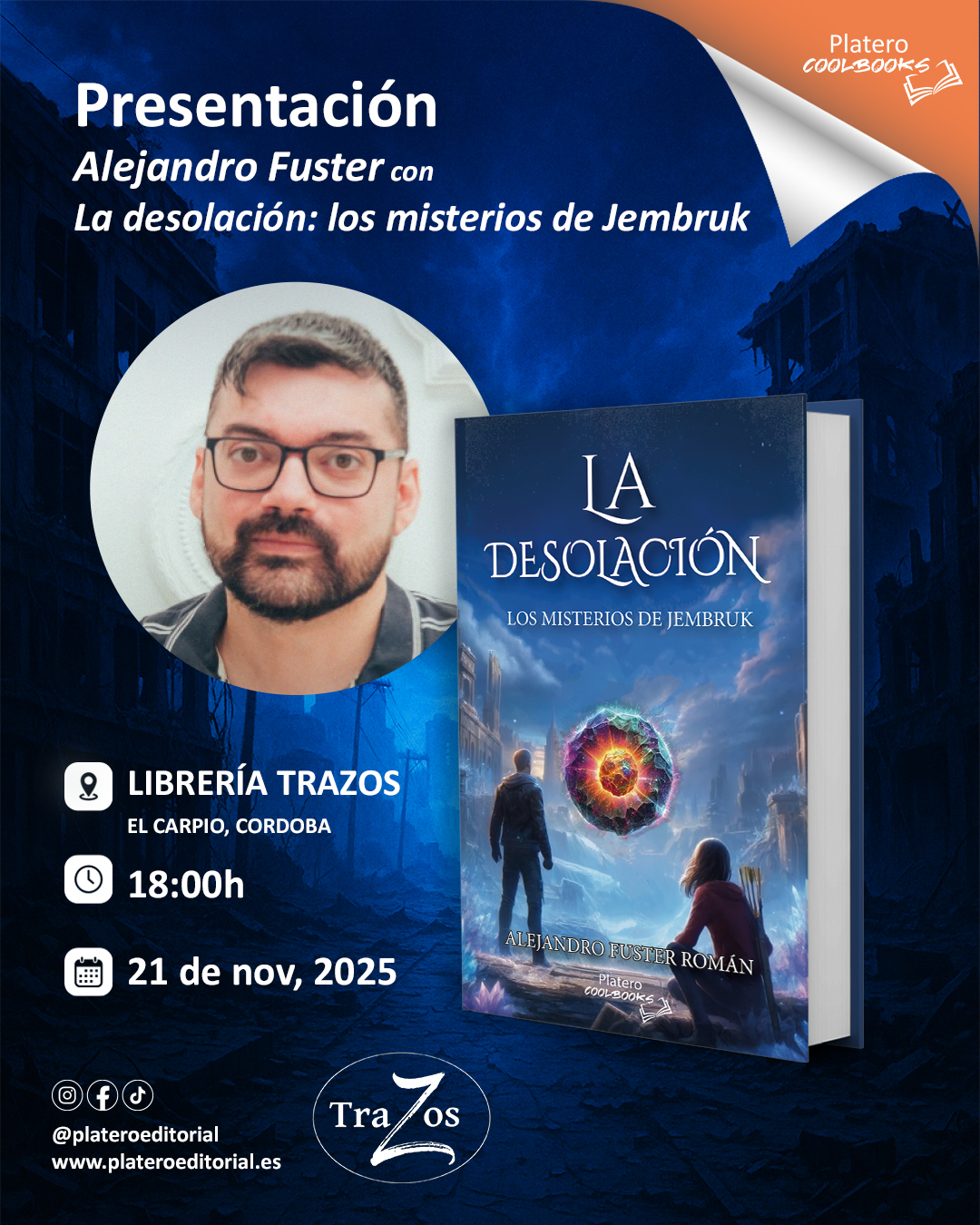 Nuestro autorAlejandro Fuster Román presentará su nueva obraLa Desolación: los misterios de Jembruk en el Librería Trazos en El Carpio (Córdoba) el día 27 de septiembre a las 18:00h.
