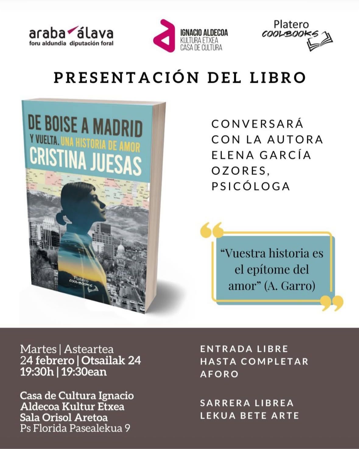 Nuestra autora Cristina Juesas presentará el próximo día 24 de febrero de 2026 a las 19:30h en la Casa de Cultura Ignacio Aldecoa en Álava su nuevo libro "De Boise a Madrid"