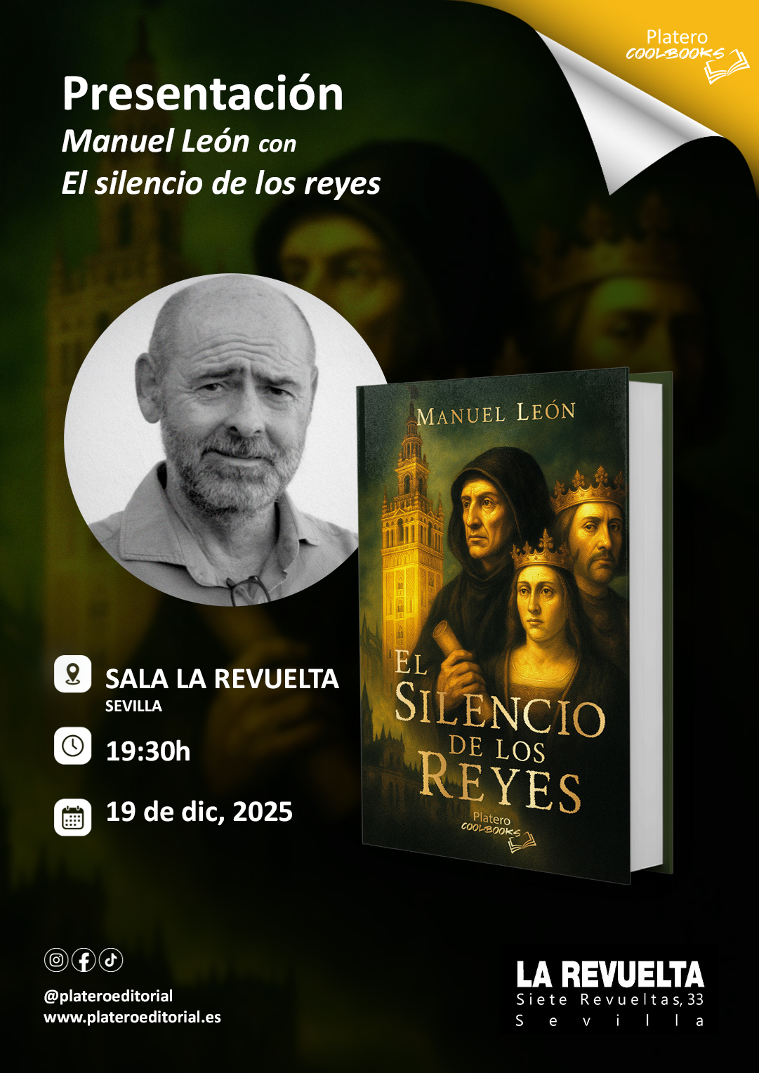 Nuestro autor Manuel León presentará su nuevo libro "El silencio de los reyes" a las 19:30h en la Sala La Revuelta en Sevilla, el día 19 de diciembre de 2025.