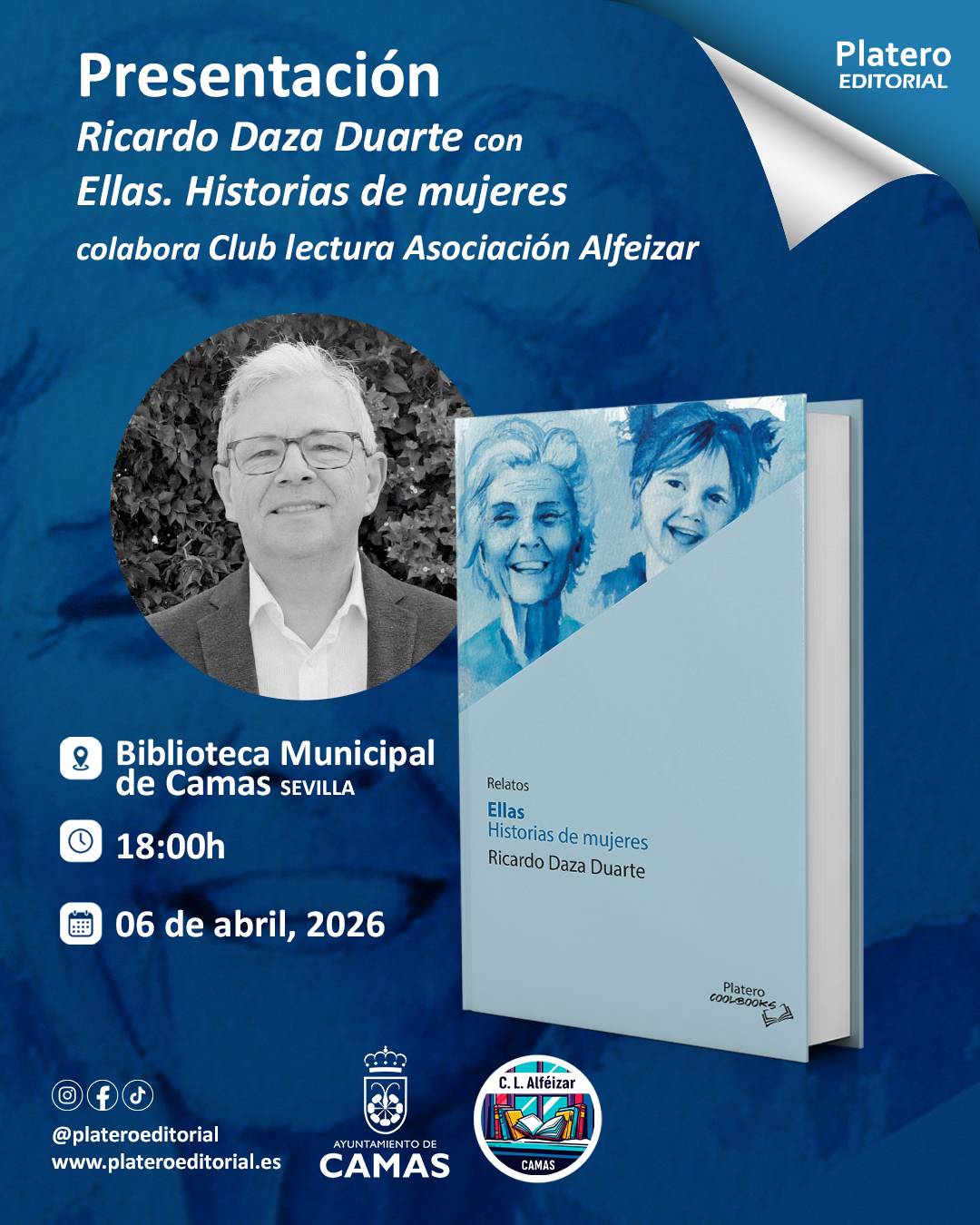 El próximo día 06 de abril de 2026 a las 18:00h en el Biblioteca Municipal de Camas en Sevilla, la nueva obra Ellas de Ricardo Daza, y colabora Club lectura Asociación Alfeizar.