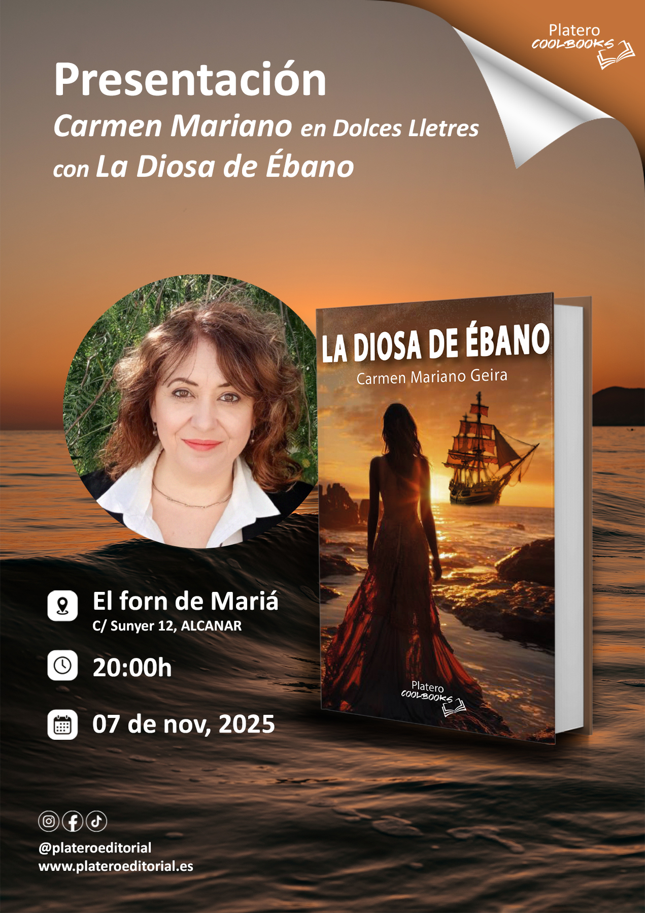 Platero Editorial se complace en invitarles a la presentación de la novelaLa Diosa de Ébano, de la autora Carmen Mariano. Este evento ofrecerá una oportunidad única para adentrarse en una historia de resistencia y superación, ambientada en el siglo XVIII y narrada por su propia autora en El forn de Mariá en Alcanar, el día 7 de noviembre a las 20:00h.