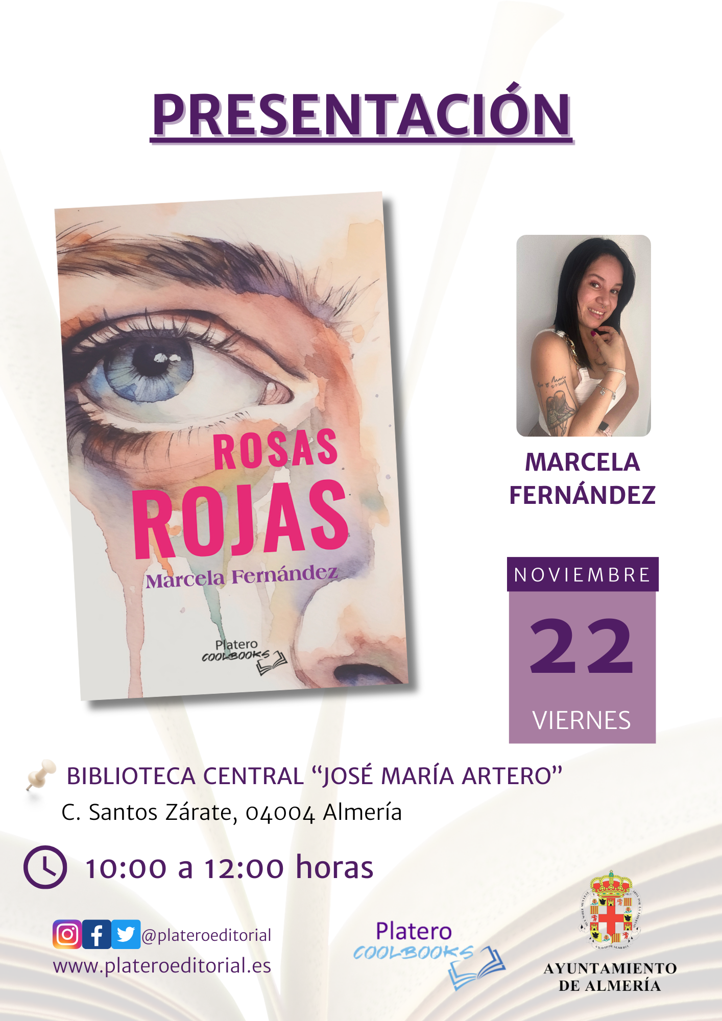 Nuestra autora Marcela Fernández presenta el próximo 22 de noviembre de 10:00 a 12:00 horas en la Biblioteca Central José María Artero su nueva obra Rosas rojas. Este evento se enmarca dentro de las actividades del 25N, organizadas por el Ayuntamiento de Almería.