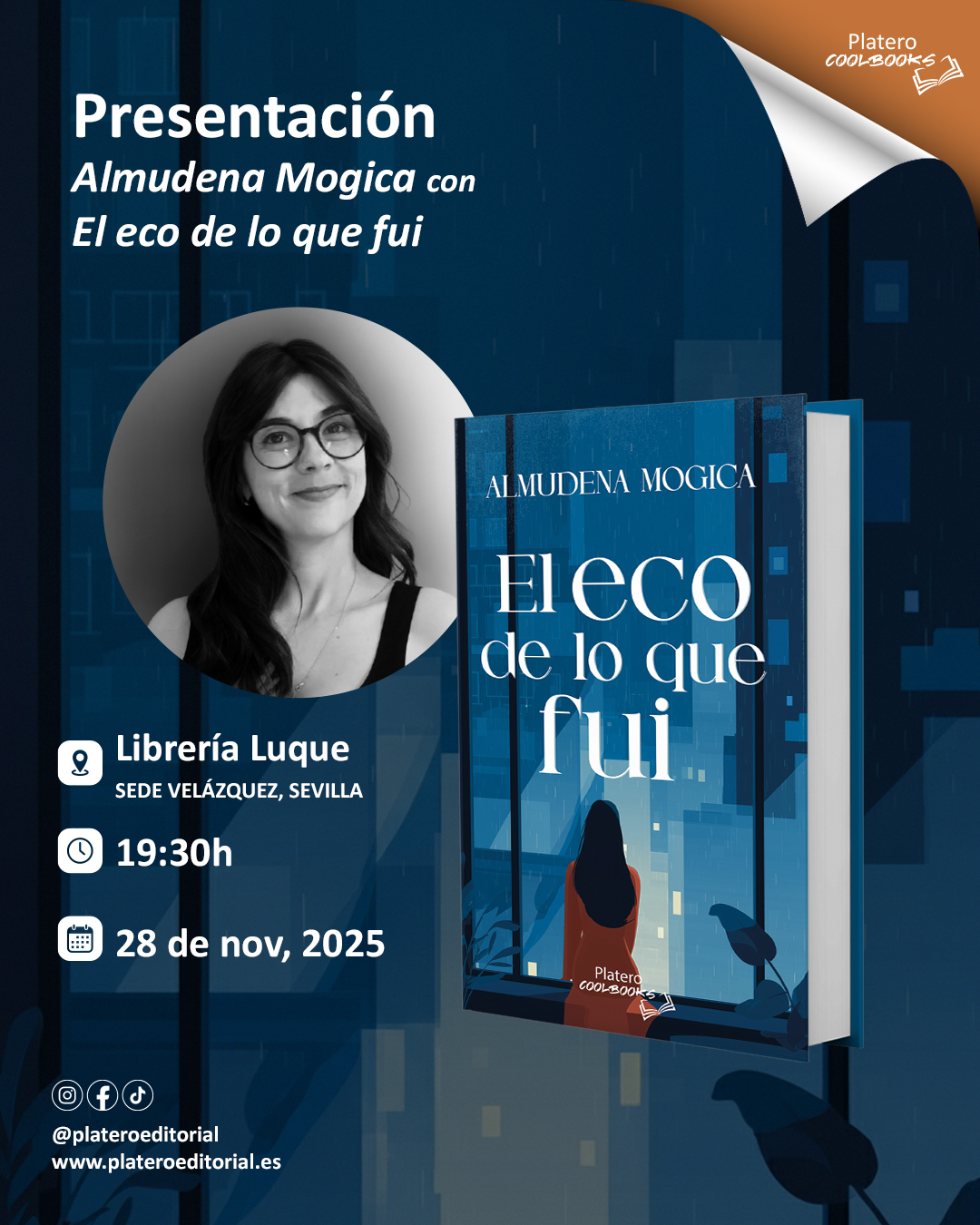 Nuestra autora Almudena Mogica presenta su nuevo libro"El eco de lo que fui"en el Librería Luque (en Sevilla) en a las 19:30 horas, el día 28 de noviembre de 2025.