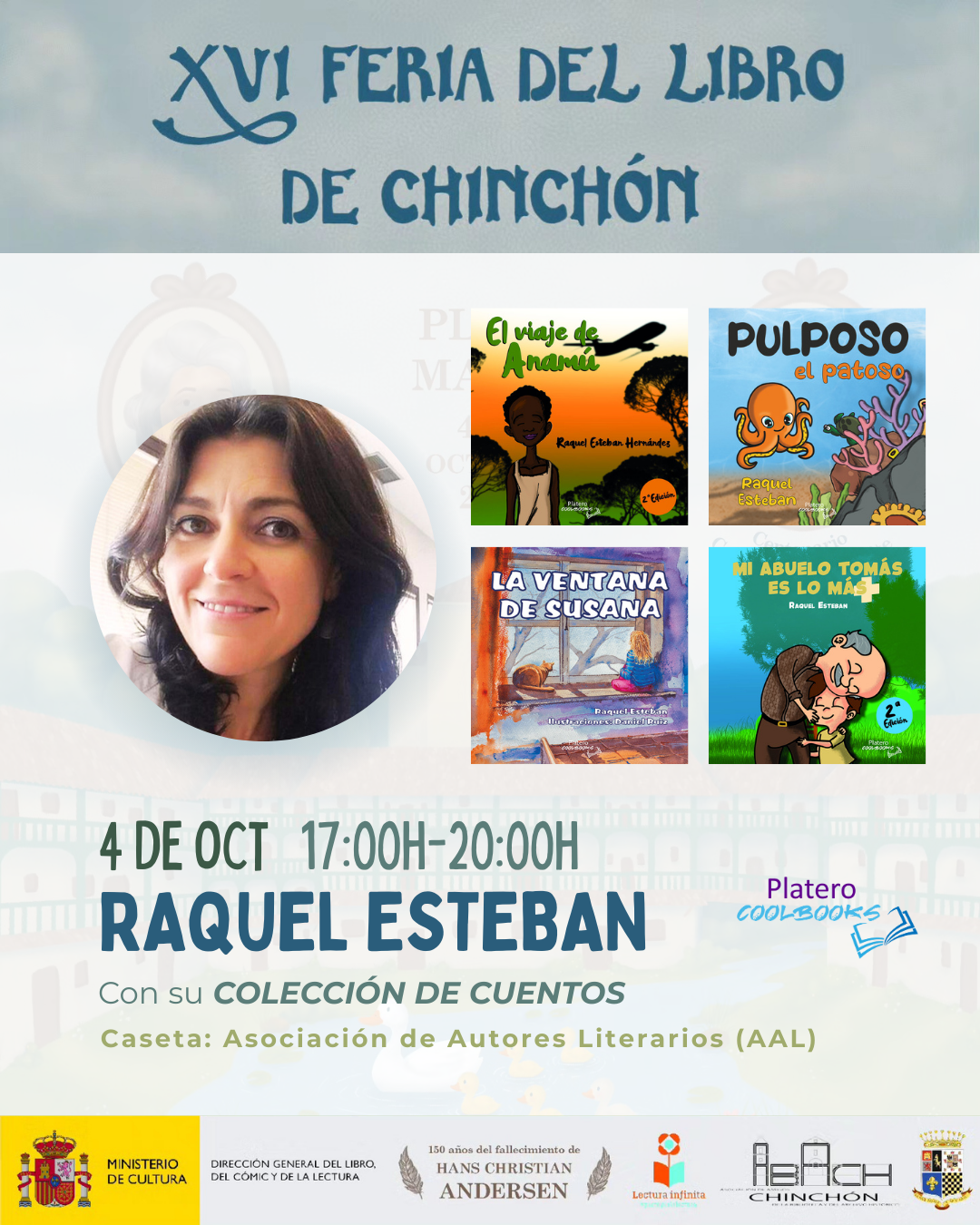 Raquel Esteban se complace en anunciar una firma de libros en la Feria del Libro de Chinchón 2025. Este emocionante evento ofrece a los amantes de la literatura la oportunidad de conocer a la autora y explorar sus cautivadoras obras, toda su colección, que incluyen "Pulposo el Patoso", "Mi Abuelo Tomás es lo más" y "El Viaje de Anamú".