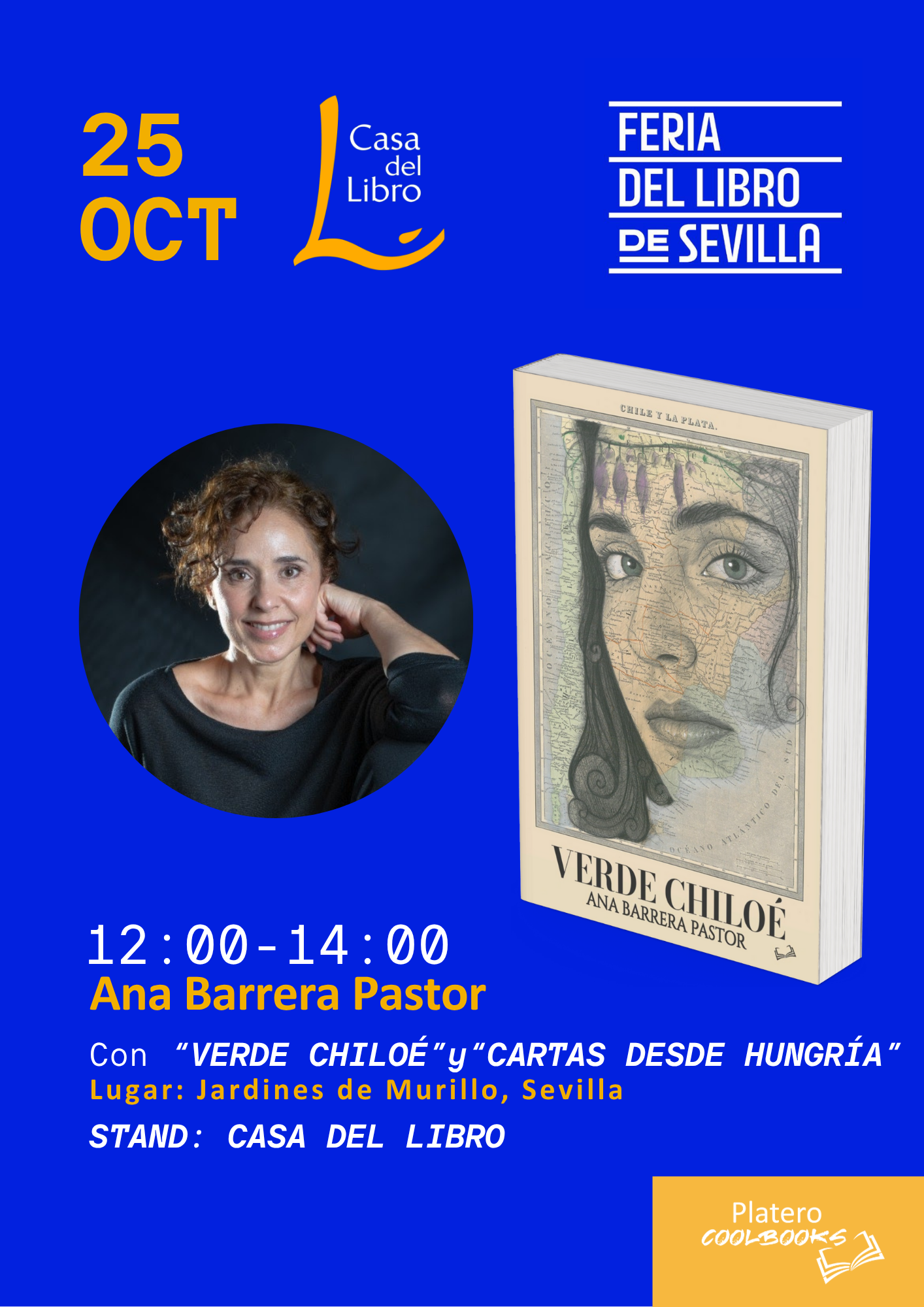Este 25 de octubre de 12 a 14h, nuestro autor Ana Barrera estará firmando ejemplares de su obra Verde Chiloé y Cartas desde Hungría en el stand de Casa del Libro dentro de la Feria del Libro de Sevilla, que se celebra en los Jardines de Murillo.