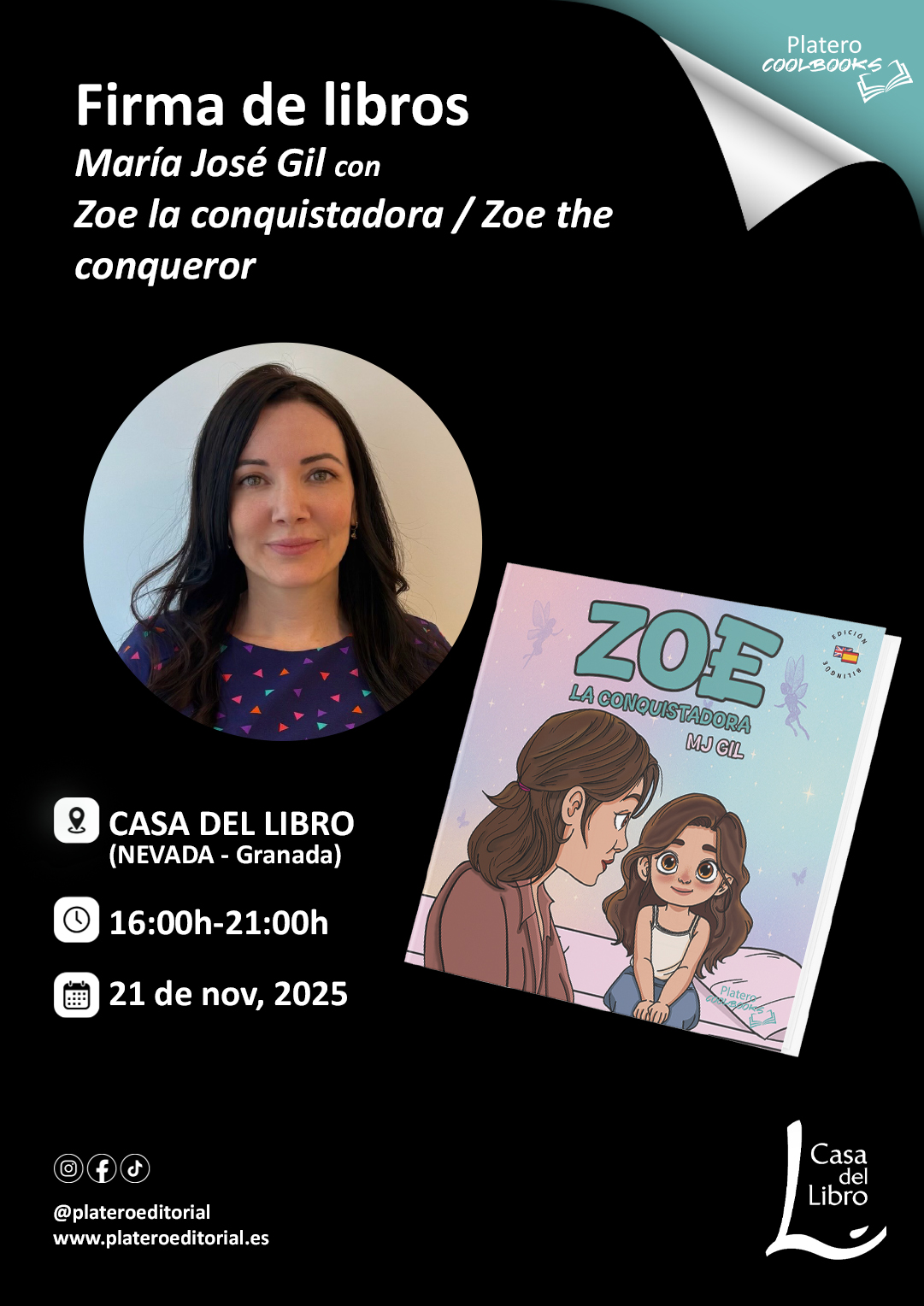 Nuestra autora MJ Gil nos firmará ejemplares de su cuento Zoe la conquistadora, en su versión bilingüe, en la Casa del Libro del Centro comercial Nevada de Granada , desde las 16:00 a las 21:00 horas, a las 21 de noviembre.