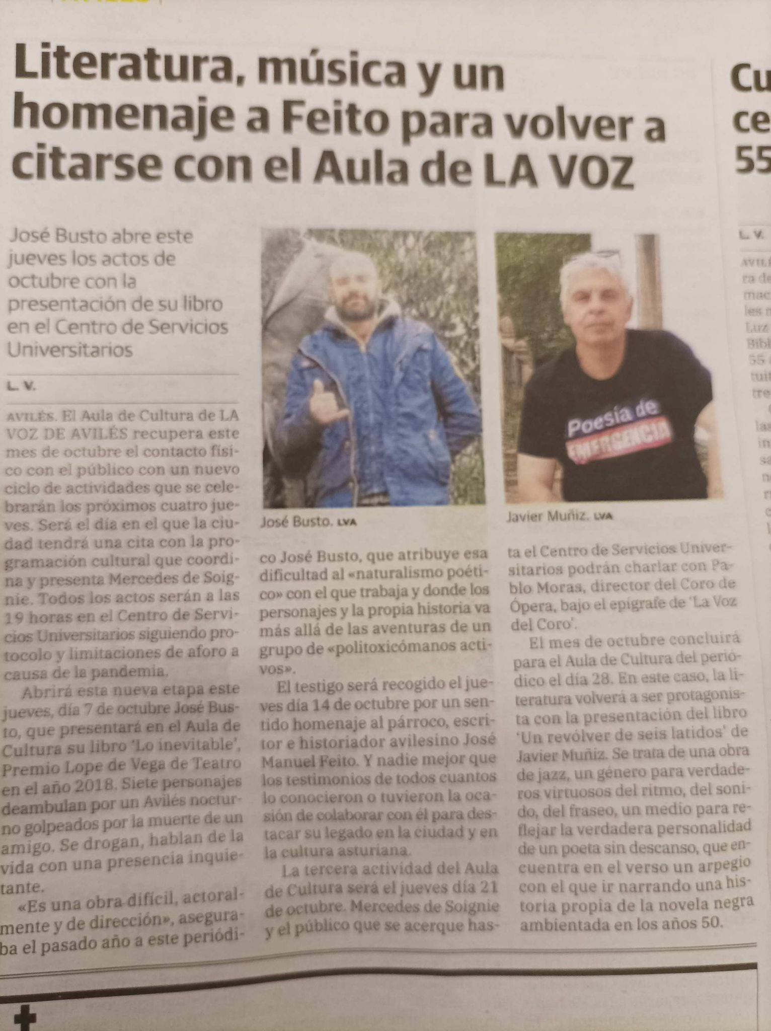 Javier Muñiz, autor de nuestro nuevo poemario, Un revólver de seis latidos, da buena muestra del peso que tiene en la cultura de su ciudad apareciendo en el periódico La voz de Avilés, que recoge la presentación de su libro el día 28 de octubre en el Centro de Servicios Universitarios de dicha ciudad. El poeta cuenta con una extensísima trayectoria poética, además de haber sido gestor cultural y de contar con numerosos premios literarios.